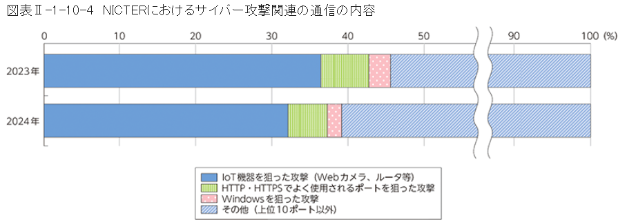 総務省「令和7年版 情報通信白書」によると、NICTER(大規模サイバー攻撃観測網)の観測データでは、2023年に観測されたサイバー攻撃関連の通信内容のうち、IoT機器を狙った通信が約3.5割を占めています。2022年と比べて、その割合は増加していることが分かります。