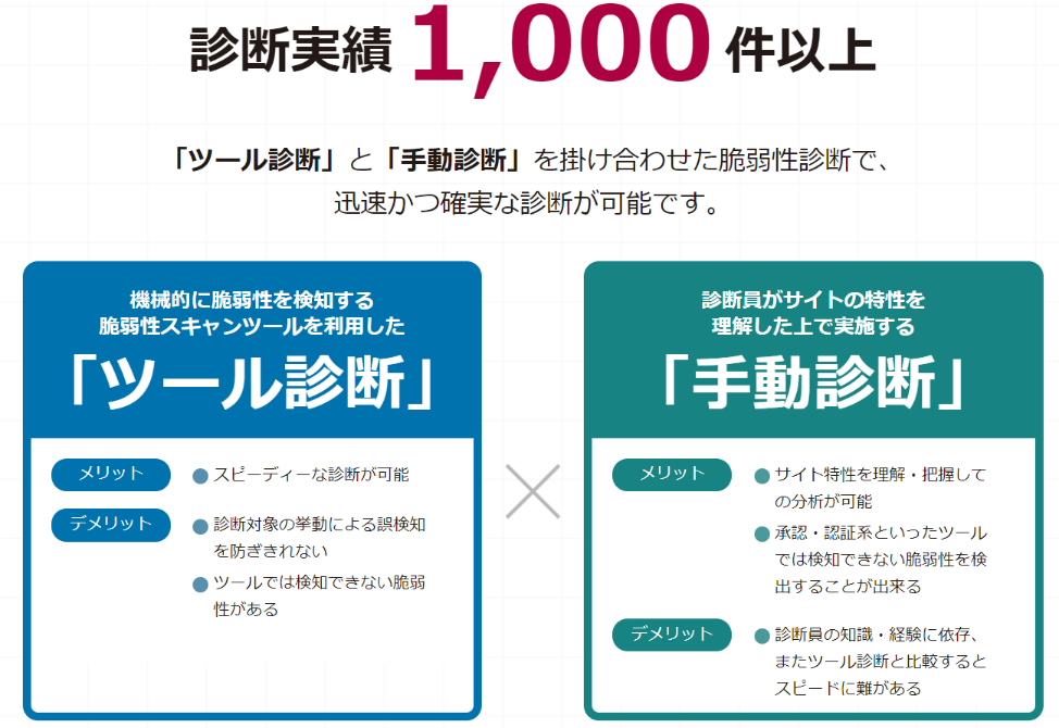 サイト公開前やシステム稼働前に、サイバー攻撃によるリスクを抑えるためにも、プロによる脆弱性診断を受けることをおすすめします。大きな被害が出てしまう前に、そのリスクを少しでもつぶしておきましょう。脆弱性診断サービスと脆弱性診断ツールを組み合わせた診断をぜひ、ご検討ください。