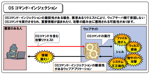 OSコマンドインジェクションは、ウェブサイトを通じて不正なOSコマンドが実行できるといった脆弱性です。OSコマンドインジェクション により、システムの制御を奪われる可能性があります。