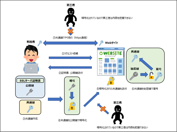 - 利用者側で、Webサイトと暗号化(https)通信を行うための鍵(共通鍵)を作成