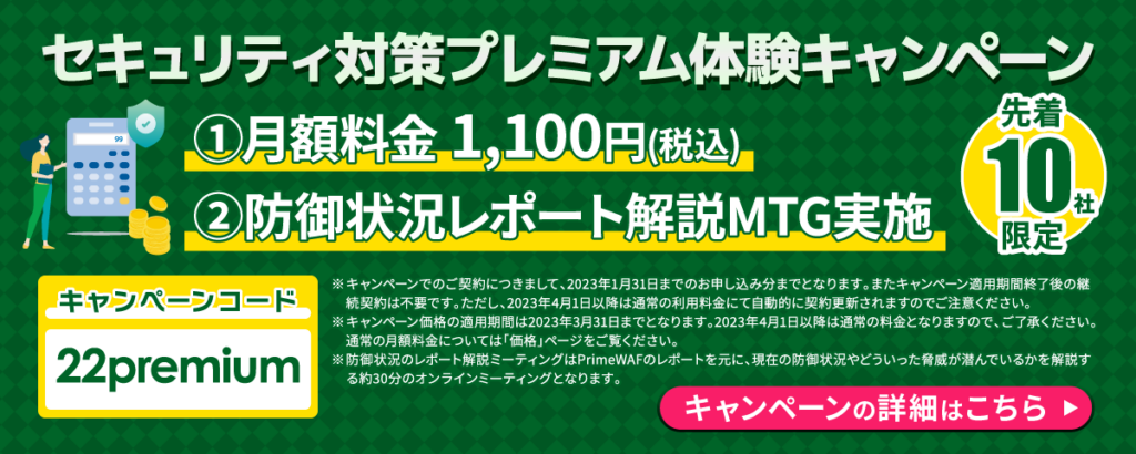 2023年1月31日までの期間に新規でPrimeWAFをお申し込みいただいたお客様先着10社限定で、月額料金を1,100円(税込)でご提供いたします。 また、導入1ヵ月と3ヶ月経過後に、防護状況のレポート解説ミーティングを実施いたします。