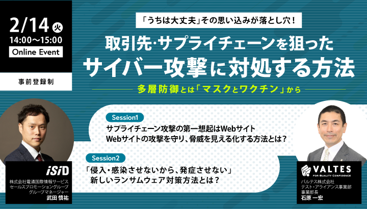 バルテス株式会社は、株式会社電通国際情報サービス(ISID)と共催で、2023年2月14日(火)に無料セミナー「取引先・サプライチェーンを狙ったサイバー攻撃に対処する⽅法」を開催いたします。
